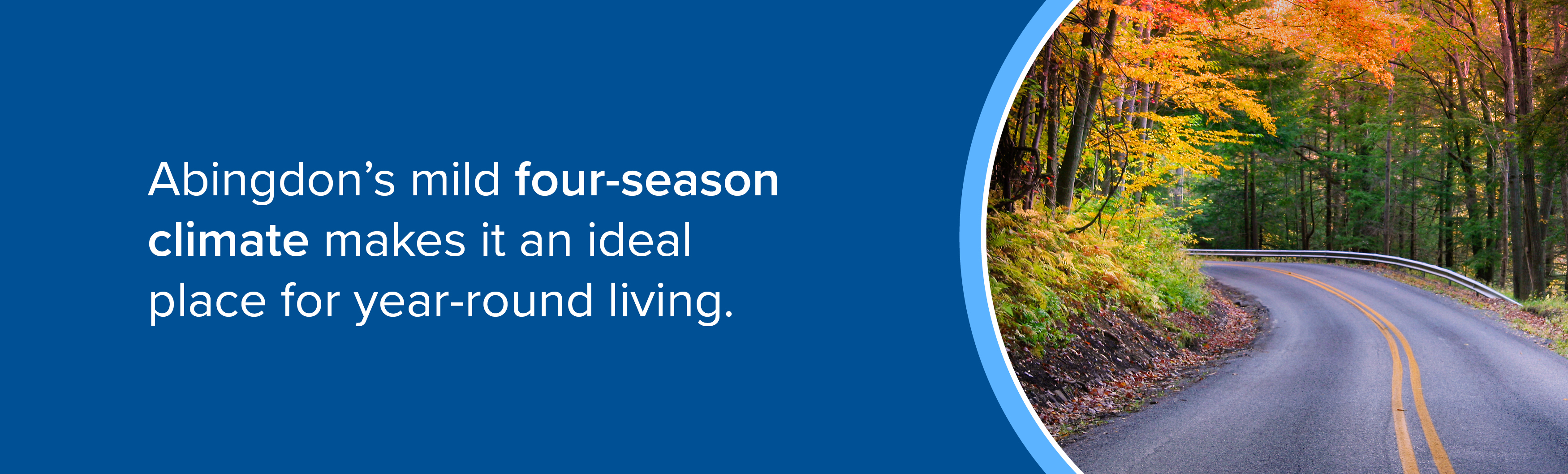 Abingdon’s mild four-season climate makes it an ideal place for year-round living. Summers are warm and inviting, perfect for outdoor festivals and dining al fresco. Fall brings brilliant foliage that lights up the mountainsides and fills the air with that crisp, cozy feeling locals love. Winter days are generally mild, with just enough chill to enjoy a cup of cocoa by the fire, and spring welcomes wildflowers and new beginnings along the Creeper Trail.